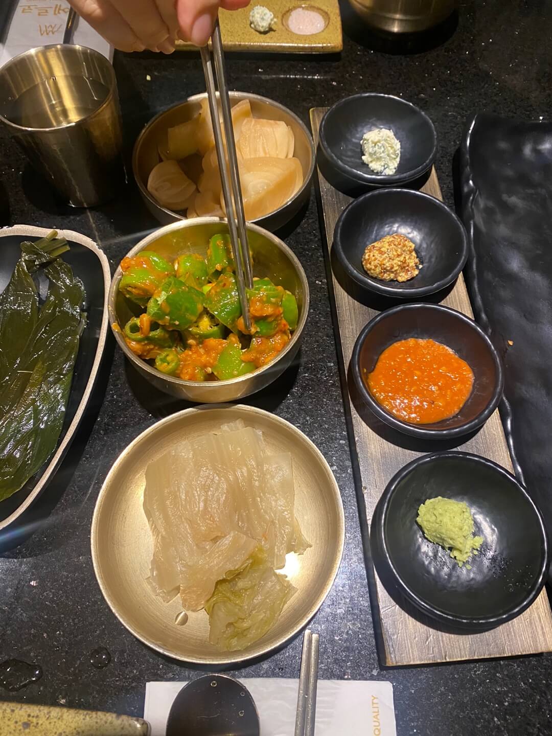 밑반찬과 4종의 소스, 명이나물 등이 나오고 개인 접시에 소금이 함께 나옵니다.
