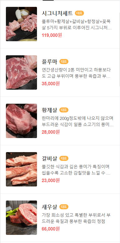 시그니처 플루마 2인분과 황제살 1인분입니다. 고기가 신선하고 좋아보이네요.