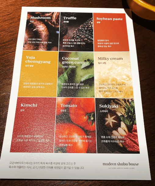 먼저 메뉴를 주문하고 나서 육수 베이스를 선택하는데요. 저희는 아이와 함께 식사할거라 가장 문안한 버섯 베이스로 주문했습니다. (다행히 아이가 잘 먹더군요!) 육수 선택시 인기 메뉴 또는 추천을 요청하면 기호에 맞게 좋은 육수를 제안해주실 것 같습니다.