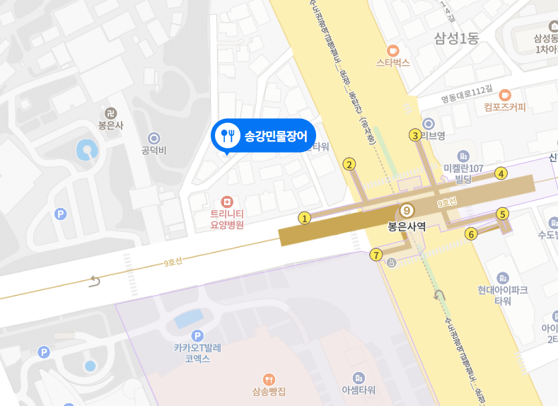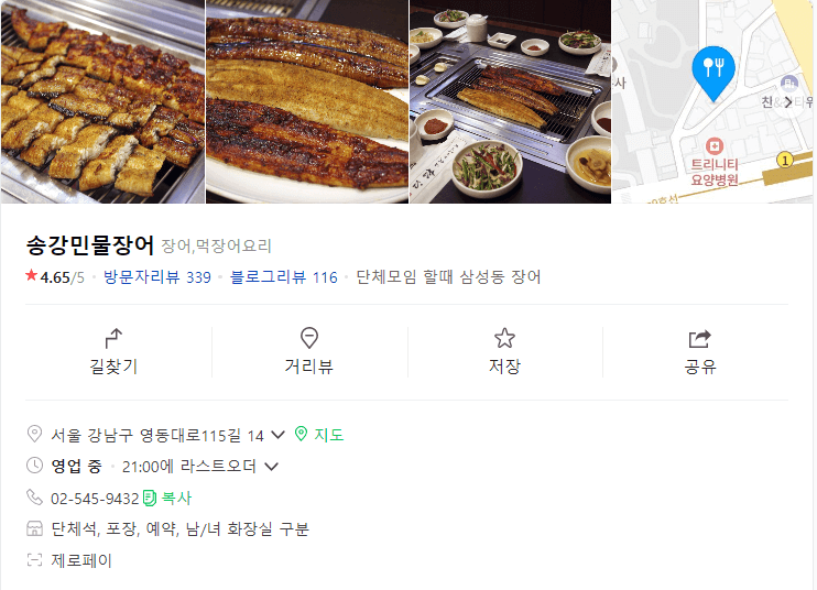 봉은사 찐 맛집! 지난번에 소개해드린 곰바위 가는 골목에 위치한 송강민물장어의 위치는 위의 지도를 참고하시면 될 듯 하네요. 봉은사에서 나와 역쪽 방향으로 가는 첫번째 골목에서 좌측으로 100m 정도가면 쉽게 찾을 수 있는 음식점입니다.