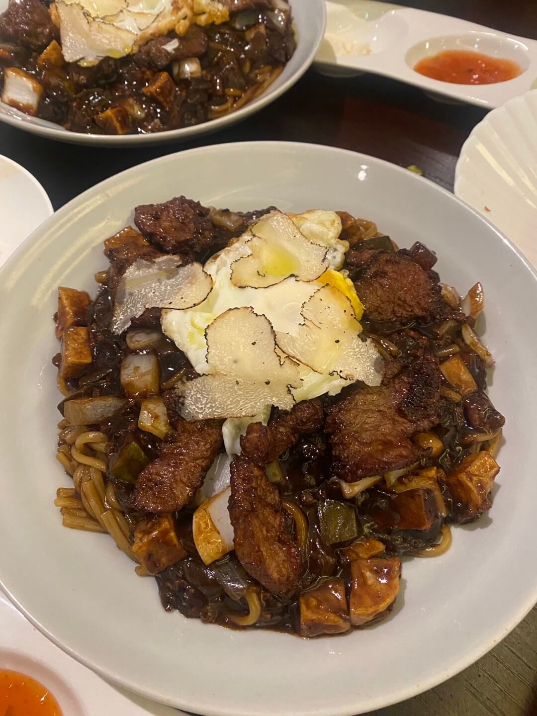 아래 사진과 같이 짜장면+스테이크+계란후라이+트러플 버섯의 구성으로 굉장히 고급스러운 풍미와 맛으로 가득한 메뉴입니다.