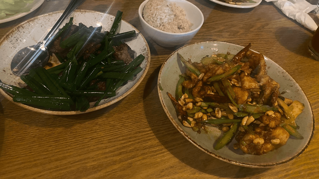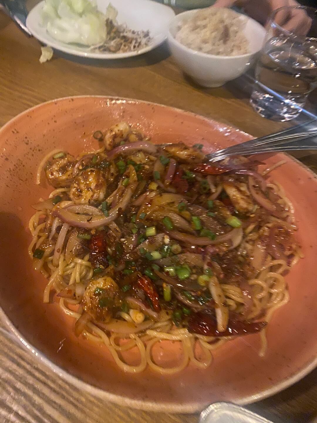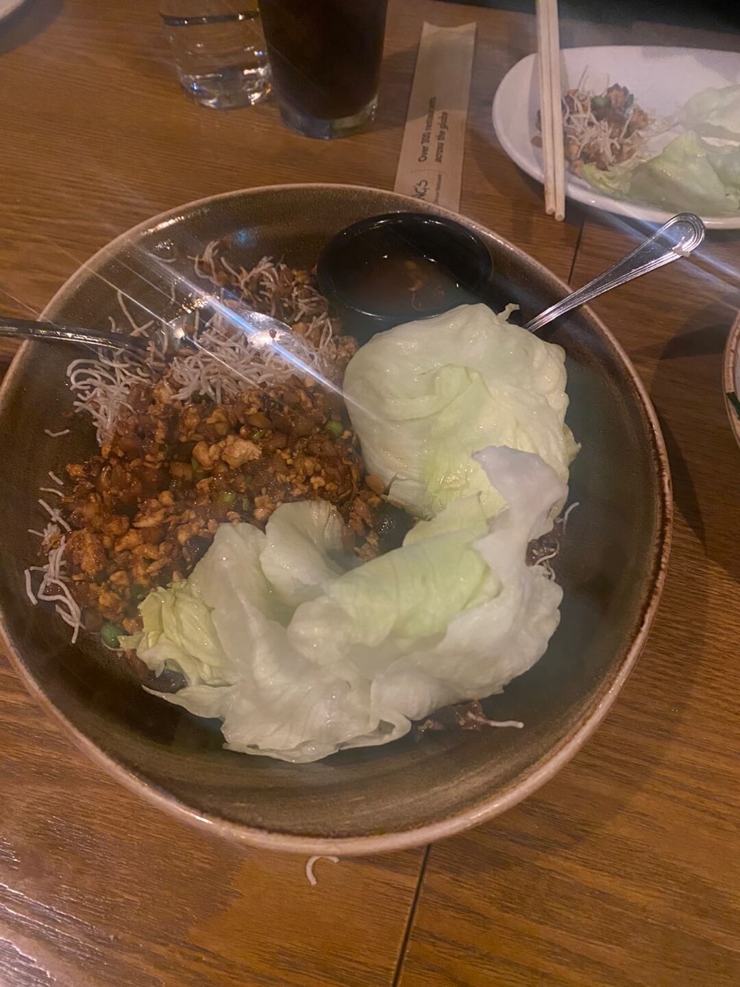 저는 몽골리안 비프 + 쿵파오 치킨 + Chang's 레터스 랩 + 프라이드 라이스 치킨 + 바나나 스프링롤 세트 메뉴에 누들을 추가해서 먹었어요. 누들 메뉴가 정확히 기억이....