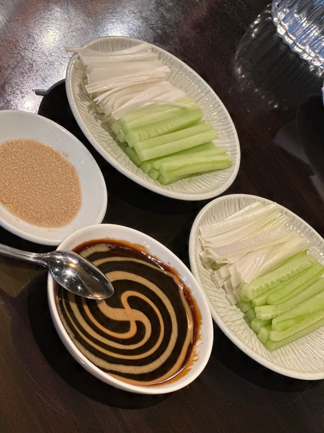 입맛을 돋구기에 충분한 딤섬이었네요- 북경오리가 준비되는동안 아래와 같이 소스와 설탕, 야채 (오이, 파)가 준비되고요- 고기를 싸 먹을수 있는 야빙이 함께 준비되어 나옵니다. (야빙만 따로 주문 가능해요!)
