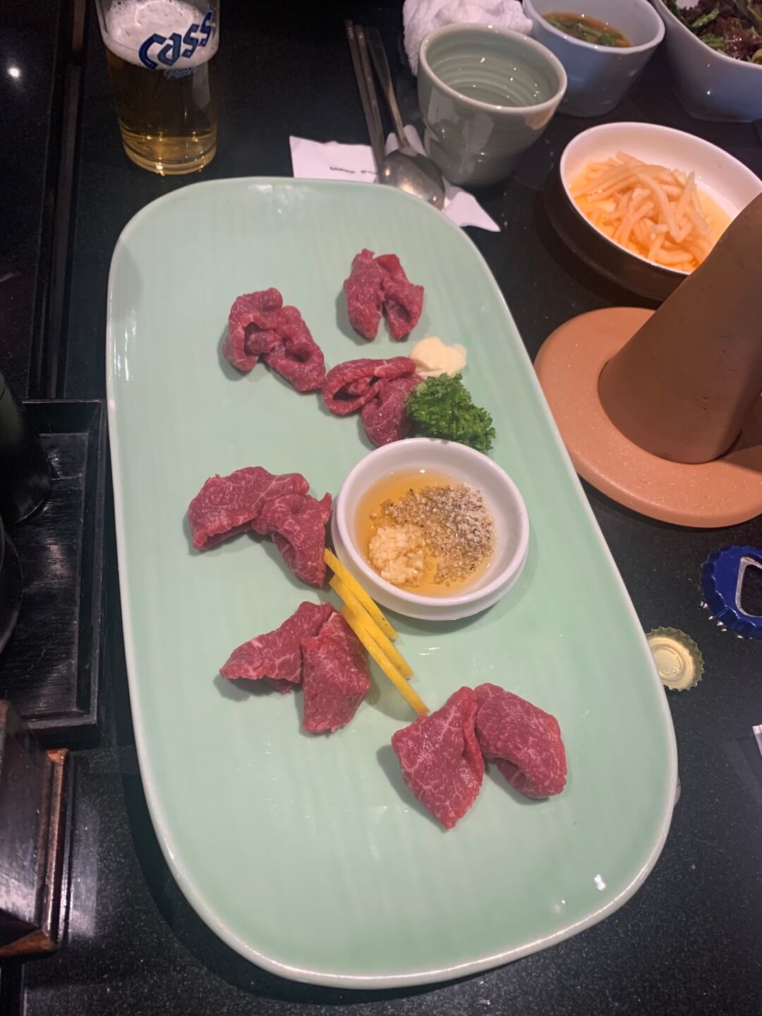 레몬 슬라이스로 레몬즙을 뿌려주고 참기름/마늘/소금장에 육회를 찍어먹어보니고급스러운 한우의 육질이 입안 가득....
