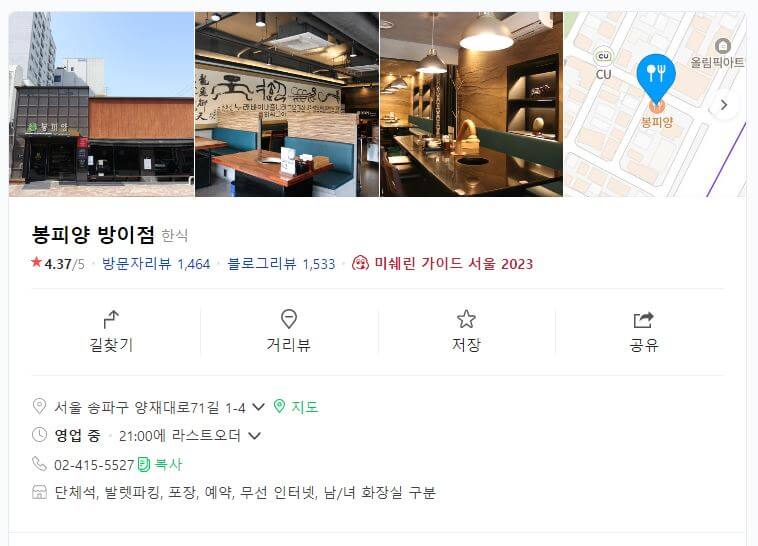 이 곳 역시 미쉐린 가이드 서울 2023에 선정된 곳인데요. 이미 주변 지인들은 많이 알고 계신 곳으로 피크타임에 웨이팅은 기본이라고 하더라고요~ 바로 봉피양 방이점입니다.