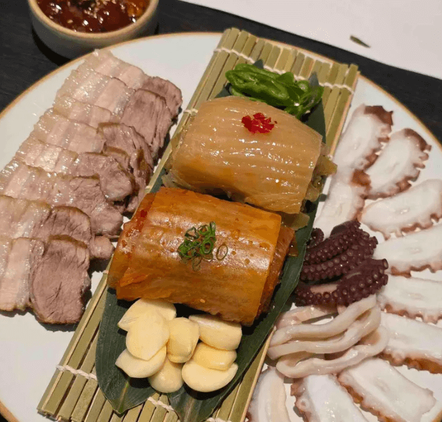 가장먼저 에피타이저로 갑오징어 미나리 무침이 제공됩니다. 이후 아래와 같이 돌문어 보쌈과 숙성회가 제공되는데요- 저희는 두가지 함께 먹고있어서 같이 서빙해달라고 요청드렸네요-