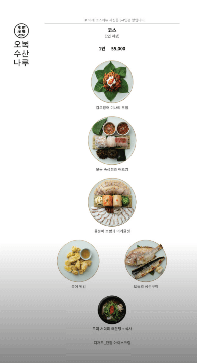 아래 메뉴에서도 볼 수 있듯이 오복-한정식 코스는 모듬숙성회/돌문어보쌈/꽃돔,고등어구이/복어튀김/서더리탕/갑오징어/미나리무침/해초쌈/어리굴젓이 차례차례 코스로 제공되는데요~ 플레이팅부터 맛까지 정말 신선하고 깔끔하면서도 남녀노소 아이의 입맛까지 모두 잡는 그런 맛이었습니다.