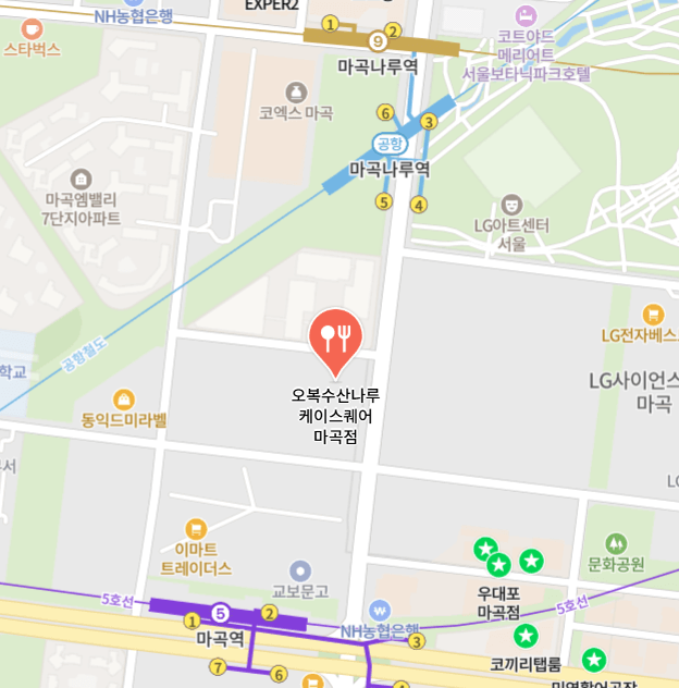 그곳은 바로 마곡 케이스퀘어 지하2층에 위치한 오복수산나루입니다. 케이스퀘어는 마곡나루역과 마곡역 사이에 위치하고 있으며 각 역에서 도보로 5분거리에 위치하고 있습니다.