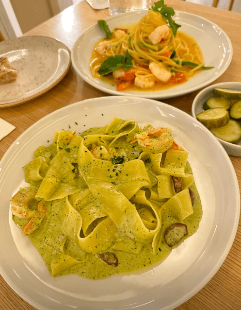 제 친구들이 시킨 홍새우 바질크림 파스타와 새우 아스파라거스 파스타입니다.