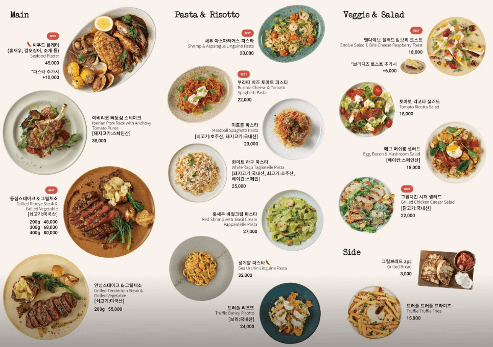 파스타 뿐만 아니라 스테이크, 시푸드 플래터 등 다양한 음식을 맛볼수 있습니다.