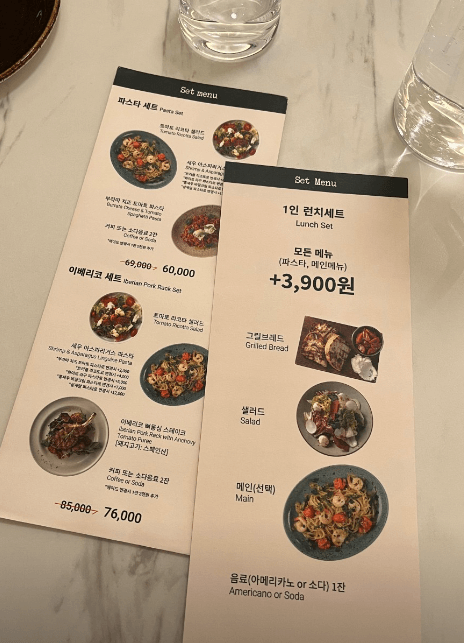 저희는 점심시간에 방문하여 1인 런치세트를 주문할 수 있었는데요. 모든 메인 메뉴에서 3900원만 더하면 그릴 브래드와 샐러드, 음료 (아메리카노 or 소다)를 함께 드실수 있습니다.